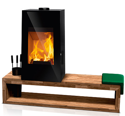 Son siège en bois attire le regard et, s'il est une invite à se réchauffer, il peut également être utilisé comme compartiment à bûches.